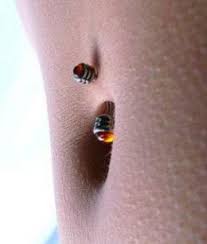 These are not technically belly-button piercings. Aftercare for a New PiercingIf you stick to proper aftercare and cleaning, you should have minimal problems with just about any piercing. The proper aftercare for navel piercing is as follows: After you get the piercing, make sure that you have a pack of miniature Dixie cups and saline solution: not "contact cleaner," but "saline solution" sold at a pharmacy. Or use a dilute solution of sea salt (1 teaspoon sea salt to 5 ounces water). Clean the navel piercing at least two to three times a day. Wash your hands first. Make sure to use a NEW, unused Dixie cup each day, using just enough saline to fully submerge the piercing. Lay on a flat surface with the cup turned upside down on your belly, in order to fully submerge the navel, allowing the saline to work its way through the piercing. Afterwards, you can dip a Q-Tip into the saline solution and gently go around both holes of the piercing to remove any excess crust or dried blood or fluids.